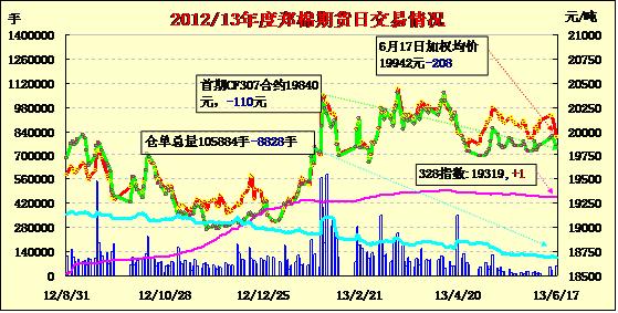 6月17日,鄭棉CF1401合約低開(kāi),早盤(pán)下探后在空頭回補(bǔ)支撐下反彈,此后橫向盤(pán)整,日線形成長(zhǎng)下影線的陰線,日內(nèi)成交量放大,持倉(cāng)量減少。CF1309合約日成交8486手,日減倉(cāng)3916手,終盤(pán)持倉(cāng)量39080手;CF1401合約日成交15560手,日減倉(cāng)5672手,終盤(pán)持倉(cāng)量55586手。 基本面情況:棉花市場(chǎng)尚未完全從節(jié)日的氛圍中復(fù)蘇,因下游中小型企業(yè)局部存在端午延長(zhǎng)假期的情況。紡織市場(chǎng)成交優(yōu)惠普現(xiàn),下游需求疲軟,訂單稀少,廠家出貨心態(tài)占據(jù)主導(dǎo),但整體走貨較差。