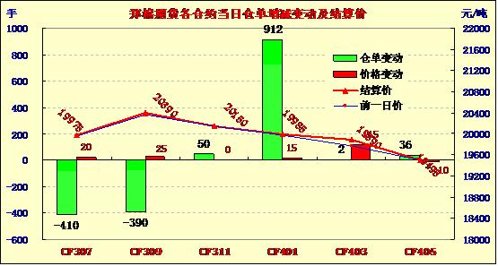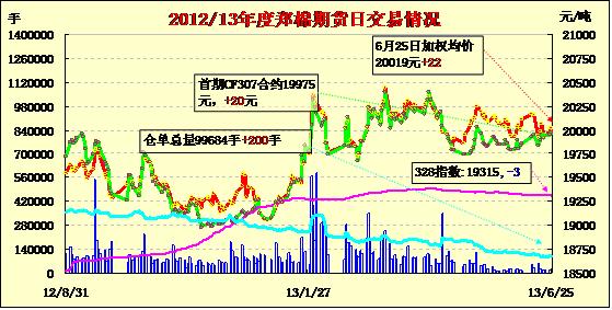 6月25日,鄭棉CF1401合約低開,早盤沖高回落,午后回升,日線形成小陽線,日內(nèi)成交量放大,持倉量增加。CF1309合約日成交2126手,日減倉390手,終盤持倉量32756手;CF1401合約日成交19164手,日增倉912手,終盤持倉量54772手?;久媲闆r:國內(nèi)棉花現(xiàn)貨市場成交清淡,報(bào)價(jià)小幅調(diào)低,整體呈現(xiàn)低迷狀態(tài)。當(dāng)前各產(chǎn)區(qū)大部棉花處于現(xiàn)蕾期,河南、湖北等地部分棉花仍處于第五真葉期。據(jù)氣象預(yù)報(bào)顯示,6月16日-6月22日一周,西北地區(qū)西部和北部、華北中部氣溫偏低、降水偏多,土壤墑情大部適宜,華北北部、黃淮溫高雨少。江淮、江漢大部地區(qū)氣溫偏高2~4℃,光照充足,降水偏少5成至1倍,但大部地區(qū)墑情仍較適宜,利于春播作物生長。預(yù)計(jì)未來一周,華北、東北地區(qū)多陣性降雨,利于土壤增墑。漢水流域、江淮、江南北部等地將出現(xiàn)持續(xù)性降雨,部分地區(qū)有大雨或暴雨,局地有大暴雨,易引發(fā)洪澇災(zāi)害。建議華北、黃淮和西北等地棉花產(chǎn)區(qū)要及時(shí)整枝打葉,改善棉田通風(fēng)條件,減少花蕾脫落。