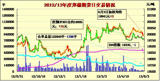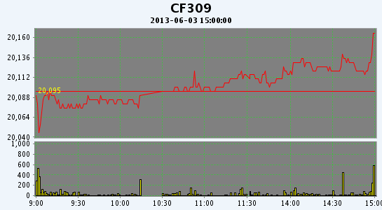 6月3日,鄭棉主要合約低開,早盤下探后在空頭回補支撐下走高,尾盤收強,日內(nèi)成交量萎縮,持倉量下滑。CF1309合約日成交7670手,日減倉1948手,終盤持倉量62440手;CF1401合約日成交10074手,日減倉136手,終盤持倉量51870手?;久媲闆r:國內(nèi)棉花現(xiàn)貨市場成交清淡,報價小幅調(diào)低,整體呈現(xiàn)低迷狀態(tài)。為使軋花企業(yè)、纖檢部門等盡快適應新棉花標準,各地纖檢部門積極做好宣傳以及培訓工作,各地企業(yè)認真學習并研究新標準。新疆地區(qū)一些棉企表示,希望纖檢部門多組織幾次關于棉花新標準的培訓,增加實物檢驗和原標準實物檢驗結(jié)果對比的課程,使軋花廠棉檢人員、負責人做到理論和實踐相結(jié)合。企業(yè)認為新的棉花質(zhì)量標準,顏色級對新疆棉非常有利,而一些地產(chǎn)棉將不占優(yōu)勢。因此不少企業(yè)開始考慮到新疆租廠以及聯(lián)合新棉收購。