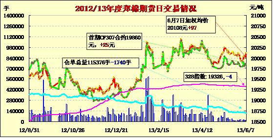 6月7日,鄭棉CF1401合約高開,盤中橫向整理,尾盤收強(qiáng),日線形成長陽線,日內(nèi)成交量萎縮大,持倉量變化不大。CF1309合約日成交6722手,日減倉1802手,終盤持倉量56158手;CF1401合約日成交5958手,日增倉80手,終盤持倉量50072手。基本面情況:國內(nèi)棉花現(xiàn)貨市場成交清淡,報價小幅調(diào)低,整體呈現(xiàn)低迷狀態(tài)。2013中國國際棉花會議在美麗的海濱城市青島市隆重開幕。論壇由中國棉花協(xié)會、全國棉花交易市場和農(nóng)業(yè)部農(nóng)村經(jīng)濟(jì)研究中心主辦,自1999年起每兩年舉辦一次,今年是第8屆,本屆的主題為“信心、轉(zhuǎn)型、共贏”。 來自17個國家和地區(qū)的近千名代表歡聚美麗的青島,共商中國和國際棉花事業(yè)。國內(nèi)外涉棉企業(yè)高度重視此次會議。