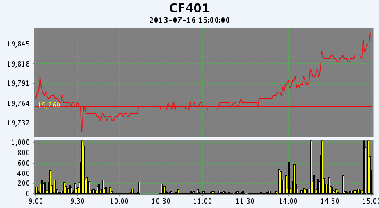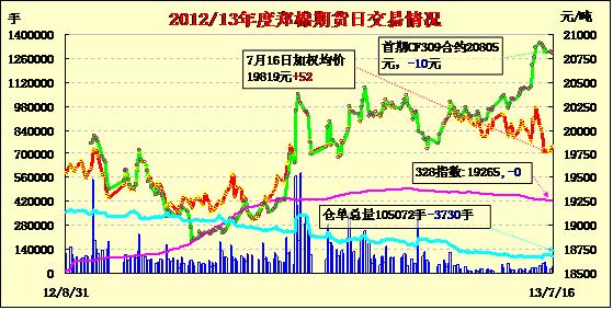 7月16日,鄭棉CF1401合約平開,早盤調整中低位增倉,午后在空頭集中回補推動下走高,日線形成1/2下影線的陽線,日內成交量溫和放大,持倉量減少。CF1309合約日成交1958手,日減倉1424手,終盤持倉量15026手;CF1401合約日成交31920手,日減倉2404手,終盤持倉量72046手。基本面情況:國內棉花現(xiàn)貨市場依舊慘淡,只有一些外棉在市場上購銷稍顯活躍。當前印度棉銷售價格為18400-18500元/噸,進口成本是18200-18300元/噸,基本上利潤很低。澳大利亞棉花銷售價格19500元/噸,成本在19200-19300元/噸。國內近兩日國儲輪出棉花不包含進口棉,紡織企業(yè)拍賣熱情明顯清淡,成交量處于低值。皮棉和棉紗市場變化不大,成交清淡。