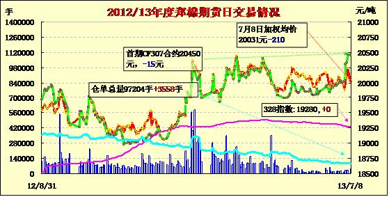 7月8日,鄭棉CF1401合約小幅高開(kāi),早盤(pán)下試后反彈盤(pán)整,午后在多頭買(mǎi)盤(pán)支撐下回升,日線(xiàn)形成陽(yáng)線(xiàn),日內(nèi)成交量放大,持倉(cāng)量增加。CF1309合約日成交2060手,日減倉(cāng)1018手,終盤(pán)持倉(cāng)量19038手;CF1401合約日成交43530手,日增倉(cāng)4336手,終盤(pán)持倉(cāng)量61498手。 基本面情況:棉花現(xiàn)貨價(jià)格維持平穩(wěn),成交依然冷清,但個(gè)別地區(qū)詢(xún)價(jià)增多。紗線(xiàn)市場(chǎng)需求繼續(xù)疲軟,價(jià)格下行,高支紗、精梳紗也有走低。儲(chǔ)備棉投放進(jìn)入最后一個(gè)月,近日投放資源放量,但交易商關(guān)注熱度不高,本周成交量有所回落。棉副市場(chǎng)成交不多,國(guó)內(nèi)棉籽資源量見(jiàn)底,山東棉粕、棉殼報(bào)價(jià)上揚(yáng),傳利好信號(hào)。