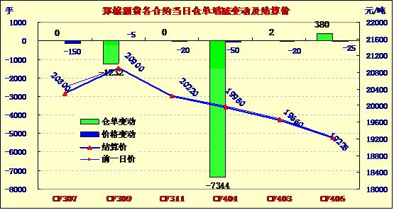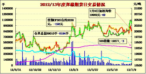 7月9日,鄭棉CF1401合約平開,早盤慣性反彈后在多頭平倉與空頭賣盤壓制下回落,盤中橫向整理,換手增量,午后在多頭集中平倉盤打壓下走低,日線形成陰線,日內(nèi)成交量萎縮,持倉量大幅減少。CF1309合約日成交1862手,日減倉1232手,終盤持倉量17806手;CF1401合約日成交29478手,日減倉7344手,終盤持倉量54154手?;久媲闆r:國內(nèi)棉花現(xiàn)貨市場(chǎng)成交清淡,報(bào)價(jià)小幅調(diào)低,整體呈現(xiàn)低迷狀態(tài)。儲(chǔ)備棉投放方面,上周儲(chǔ)備棉投放放量,而紡織企業(yè)因資金緊張,競(jìng)拍熱情下降。隨著不少中小紡企銷售情況不佳,加上資金回籠慢,備用資金緊張,經(jīng)營困難的情況不斷惡化,不少企業(yè)關(guān)停一部分生產(chǎn)線。因此市場(chǎng)上對(duì)于皮棉現(xiàn)貨的需求大幅縮減。當(dāng)前進(jìn)入7月份,不少棉花企業(yè)開始了新棉收購前的準(zhǔn)備工作,檢修設(shè)備、修整廠房等等一系列準(zhǔn)備工作已經(jīng)開展,積極做好新年度收購交儲(chǔ)工作。