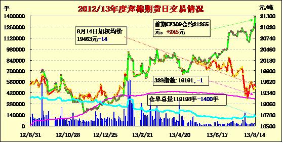 8月14日,鄭棉CF1401合約高開,盤中區(qū)間整理,尾盤在多頭平倉壓力下調(diào)整,日線形成小陽線星,日內(nèi)成交量放大,持倉量減少。CF1401合約日成交22834手,日減倉5018手,終盤持倉量66134手;CF1405合約日成交15940手,日增倉3836手,終盤持倉量37774手?;久媲闆r:國內(nèi)棉花現(xiàn)貨市場(chǎng)成交清淡,價(jià)格繼續(xù)走低。近期隨著全棉紗行情依舊不佳,全棉紗銷售狀況不佳,加上天氣炎熱,棉紗市場(chǎng)鮮有成交,紗廠停機(jī)放假較多,棉紗價(jià)格繼續(xù)緩慢下行。而之前積極拍儲(chǔ)備棉的紡織企業(yè)庫存充裕,但是資金占有量大,一時(shí)間銷售慢行資金回籠變慢。對(duì)于后市,多數(shù)棉花企業(yè)慣性認(rèn)為政策市場(chǎng),因此,對(duì)于后市主要還是考慮政策因素多一些。