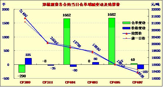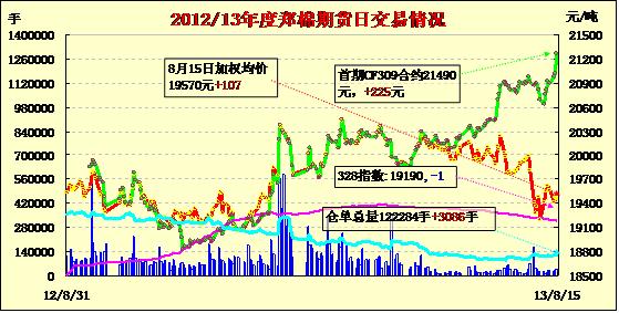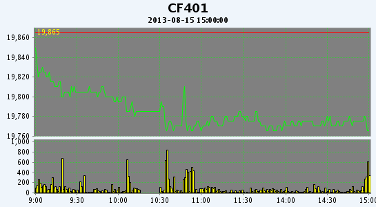 8月15日,鄭棉CF1401合約低開(kāi),盤(pán)中在空頭賣(mài)盤(pán)壓制下盤(pán)跌,日線形成陰線,日內(nèi)成交量萎縮,持倉(cāng)量增加。CF1401合約日成交18782手,日增倉(cāng)1662手,終盤(pán)持倉(cāng)量67796手;CF1405合約日成交6920手,日增倉(cāng)1682手,終盤(pán)持倉(cāng)量39456手。基本面情況:國(guó)內(nèi)棉花現(xiàn)貨市場(chǎng)成交清淡,價(jià)格走低。近期以來(lái)新疆阿瓦提每天都伴隨著38攝氏度以上的高溫干熱,一直到11日氣溫才開(kāi)始回落,造成了該地區(qū)長(zhǎng)絨棉嚴(yán)重減產(chǎn),預(yù)計(jì)此次高溫長(zhǎng)絨棉畝產(chǎn)將減少15%。而長(zhǎng)江流域湖南、湖北、安徽、江蘇均出現(xiàn)持續(xù)38度以上的高溫民,局部地區(qū)地區(qū)棉苗干枯,產(chǎn)量下降。