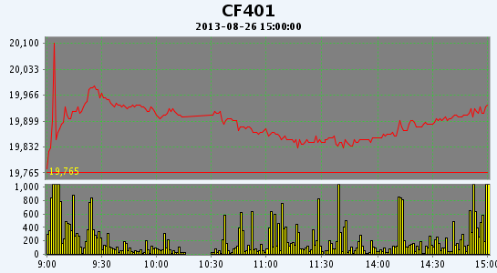 8月26日,鄭棉CF1401合約低開,早盤在空頭回補(bǔ)支撐下沖高,隨后在逢高平倉(cāng)盤的壓制下回落盤整,日線形成長(zhǎng)上影線的陽線,日內(nèi)成交量成倍放大,持倉(cāng)量減少。CF1401合約日成交53310手,日增倉(cāng)1524手,終盤持倉(cāng)量62792手;CF1405合約日成交19062手,日減倉(cāng)3516手,終盤持倉(cāng)量33346手?;久媲闆r::因近日外棉報(bào)價(jià)持續(xù)下跌,部分買家像港口發(fā)出詢盤,實(shí)際成交量不大。清關(guān)外棉保持企穩(wěn),但買家平平,成交清淡。