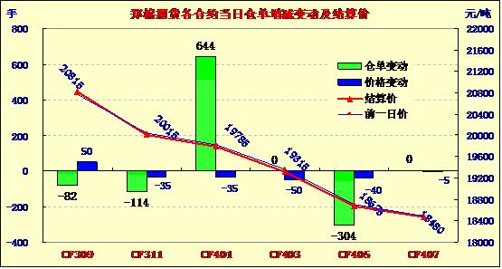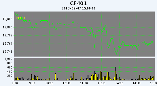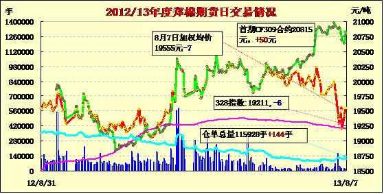 8月7日,鄭棉CF1401合約平開,盤中窄幅整理,午后增倉下滑,日線形成陰線,日內(nèi)成交量放大,持倉量增加。CF1401合約日成交17066手,日增倉644手,終盤持倉量67052手;CF1401合約日成交4908手,日減倉304手,終盤持倉量32536手?;久媲闆r:國內(nèi)棉花現(xiàn)貨市場繼續(xù)呈現(xiàn)低迷狀態(tài),報價平穩(wěn)。一些棉區(qū)現(xiàn)貨市場基本處于空檔期,買賣清淡。紡織企業(yè)淡季持續(xù),成品價格下降,成交也處于少量狀態(tài)。當前各棉花企業(yè)主要關(guān)注新棉長勢以及后期政策動向。新棉長勢方面,今年長江流域一些棉區(qū)高溫天氣持續(xù),主要是安徽地區(qū),連續(xù)十多天的高溫天氣,對棉花生長造成影響,并且棉農(nóng)的田間管理也因高溫而擱淺。
