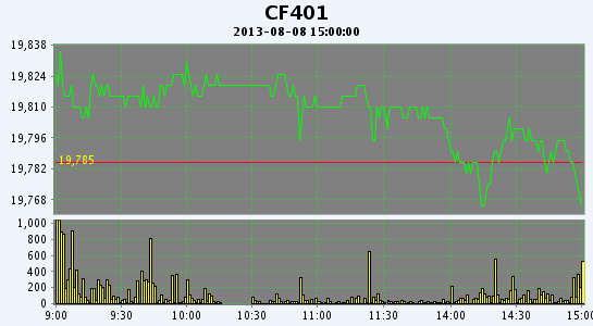 8月8日,鄭棉CF1401合約高開,盤中窄幅整理,午后增倉下滑,日線形成陰線,日內(nèi)成交量放大,持倉量增加。CF1401合約日成交25678手,日增倉4690手,終盤持倉量71742手;CF1405合約日成交6516手,日減倉1074手,終盤持倉量31462手?;久媲闆r:近日,紡企對進口棉詢價看貨較多,以便直觀掌握港口貿(mào)易商的報價和貨源質(zhì)量。由于近期澳棉集中到港通關,市場貨源較多,小部分報價回落至19900元/噸以內(nèi),實際成交商談為主,銷售速度有所加快。印度棉庫存量下降,質(zhì)量好些的報價稍微松動。因此,近期棉價重心緩慢下移,純棉紗、布價格穩(wěn)中偏弱;滌綸短纖價格震蕩上行,推高了下游滌棉紗、布成本,帶動部分滌棉產(chǎn)品報價有所上調(diào),但幅度較小。