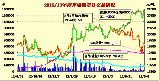 8月9日,鄭棉CF1401合約高開,盤中區(qū)間整理,午后一度下滑,尾盤回升,日線形成陽線星,日內(nèi)成交量變化不大,持倉量減少。CF1401合約日成交24826手,日減倉2732手,終盤持倉量69020手;CF1405合約日成交6316手,日增倉114手,終盤持倉量31576手?;久媲闆r:國內(nèi)棉花現(xiàn)貨市場成交清淡,報價小幅調(diào)低,繼續(xù)呈現(xiàn)低迷狀態(tài)。多數(shù)棉花企業(yè)目前積極籌備新年度收購工作,另外不少企業(yè)表示今年資金情況較為緊張,上年度棉花銷售獲利較少,加上當前人工成本等大幅上漲,開支相對增加,新年度資金預算較為緊張。棉副產(chǎn)品棉籽資源幾近枯竭,部分地區(qū)已經(jīng)呈現(xiàn)青黃不接的狀態(tài),油廠開工率進一步下降。據(jù)悉,部分企業(yè)資金問題比較突出,這也是限制企業(yè)開工的一個重要原因。