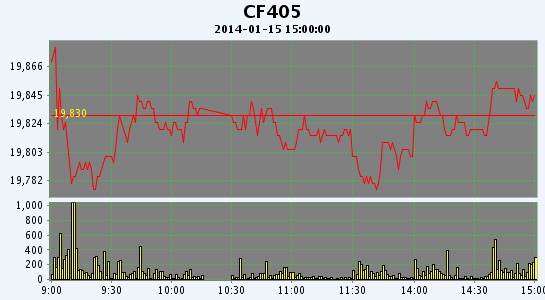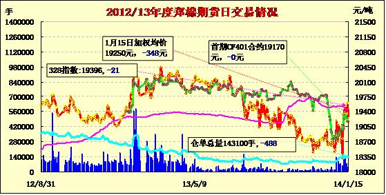 1月15日,鄭棉CF1405合約低開,早盤在多頭平倉盤壓力下調(diào)整,隨后在空頭回補和逢低買盤推動下回升,日線形成長下影線的陰線星,日內(nèi)成交量萎縮,持倉量減少。CF1405合約日成交22944手,日減倉942手,終盤持倉量75502手;CF1409合約日成交2262手,日減倉156手,終盤持倉量30600手?;久媲闆r:據(jù)中國海關(guān)數(shù)據(jù)統(tǒng)計,2013年12月份我國累計進口棉花61萬噸,環(huán)比增加252%,同比增加14%,12月進口量之大,超出市場預(yù)期。