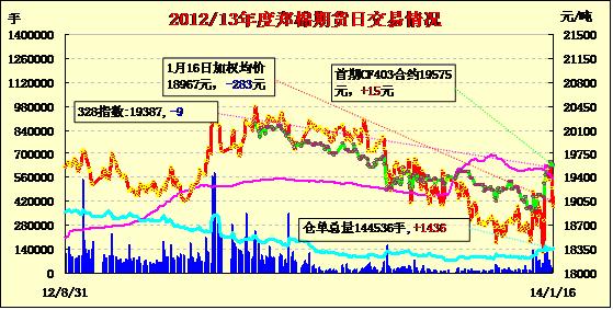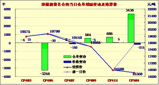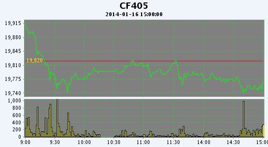 1月16日,鄭棉CF1405合約高開,早盤在多頭平倉盤壓力下調(diào)整,隨后在空頭回補和逢低買盤推動下回升,午后再度受到平倉盤壓力回落,日線形成高開陰線,日內(nèi)成交量萎縮,持倉量減少。CF1405合約日成交24316手,日減倉3246手,終盤持倉量71256手;CF1409合約日成交2512手,日增倉564手,終盤持倉量31164手?;久媲闆r:港口美棉和澳棉因為資源不多,價格上漲,需求不錯。印度棉現(xiàn)貨價格穩(wěn)定,走貨一般;全棉紗行情仍舊弱勢,市場走貨清淡,不少廠家提前放假。