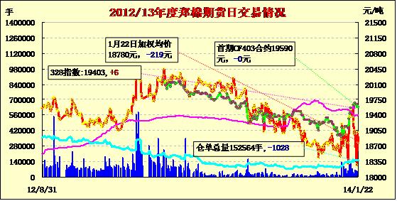 1月22日,鄭棉CF1405合約高開(kāi),早盤區(qū)間震蕩,午后在平倉(cāng)盤與空頭賣盤打壓下走低,日線形成高開(kāi)陰線,日內(nèi)成交量萎縮,持倉(cāng)量增加。CF1405合約日成交18082手,日增倉(cāng)598手,終盤持倉(cāng)量75580手;CF1409合約日成交9150手,日減倉(cāng)2880手,終盤持倉(cāng)量24526手。