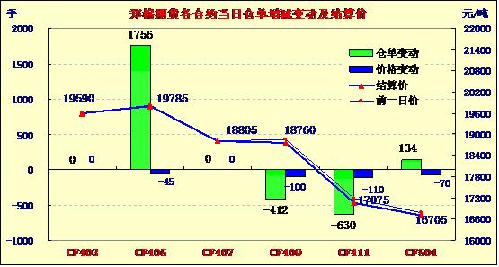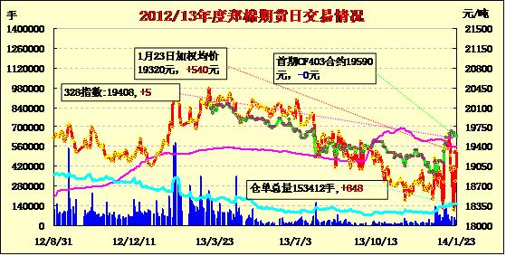 1月23日,鄭棉CF1405合約低開,早盤受多頭買盤推動回升,午后在空頭賣盤壓制下回落,日線形成低開陰線星,日內(nèi)成交量變化不大,持倉量增加。CF1405合約日成交18072手,日增倉1756手,終盤持倉量77336手;CF1409合約日成交1642手,日減倉412手,終盤持倉量24114手?;久媲闆r:目前港口較多的仍是印度棉,澳棉、美棉及巴西棉有報價,但基本有價無市,近期港口印度現(xiàn)貨價格在18200元/噸左右,成交一般。