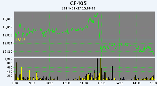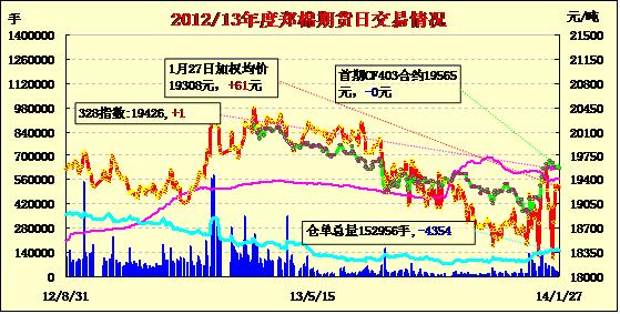 1月27日,鄭棉CF1405合約低開,早盤區(qū)間震蕩,午后一度上沖,但是受到多頭平倉壓制下滑,尾盤收低,日線形成低開小陰線,日內(nèi)成交量萎縮,持倉量減少。CF1405合約日成交22200手,日減倉5516手,終盤持倉量75078手;CF1409合約日成交656手,日減倉96手,終盤持倉量24090手。