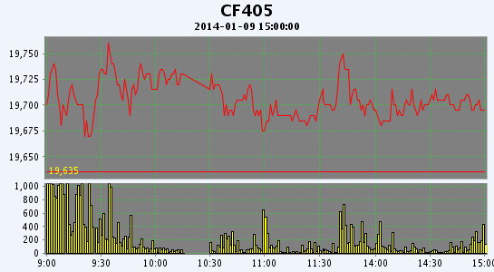 1月9日,鄭棉CF1405合約低開,早盤沖高后在多頭平倉打壓下盤跌,日線形成長上影線的陽線,日內(nèi)成交量萎縮,持倉量減少。CF1405合約日成交49294手,日減倉9856手,終盤持倉量72942手;CF1409合約日成交11016手,日減倉2174手,終盤持倉量29362手。