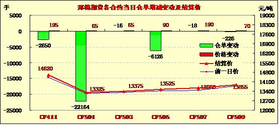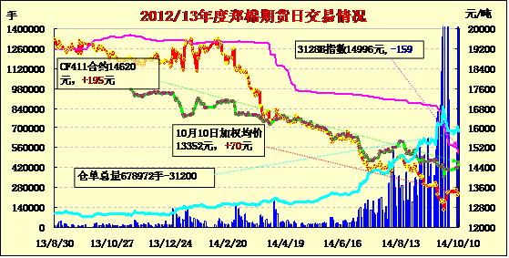 10月10日,鄭棉CF1501合約低開,早盤下試后在多頭買盤推動(dòng)下回升,盤中高位震蕩減倉(cāng),尾盤收于日內(nèi)次高點(diǎn),日線形成陽(yáng)線,日內(nèi)成交量萎縮,持倉(cāng)量減少?;久媲闆r:國(guó)慶節(jié)后,河南南陽(yáng)多數(shù)棉花收購(gòu)企業(yè)仍以觀望為主,只有少量棉花企業(yè)開門收購(gòu)。1228級(jí)收購(gòu)報(bào)價(jià)2.7元/斤,2227級(jí)報(bào)價(jià)2.65元/斤,棉農(nóng)對(duì)當(dāng)前價(jià)格難以接受,交售不積極,偶有詢價(jià),但無(wú)人交售。而棉企方面由于對(duì)當(dāng)?shù)?a href='http://m.qdhqly.cn/News/Channel/?CID=31' title='更多棉花信息' target='_blank'>棉花品級(jí)和質(zhì)量不看好,為了減少風(fēng)險(xiǎn),收購(gòu)意愿也不強(qiáng)烈,市場(chǎng)進(jìn)入僵持階段。