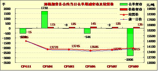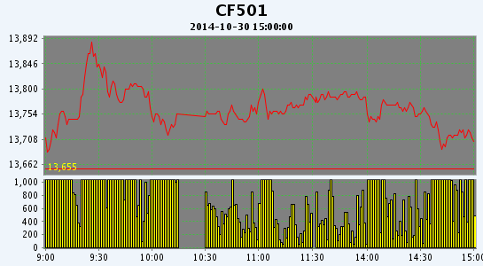 10月30日,鄭棉CF1501、1505合約低開,早盤沖高回落后橫向震蕩,尾盤在平倉盤打壓下收弱,日線形成帶上影線的陽線,日內(nèi)成交量放大,持倉量近增遠(yuǎn)減。