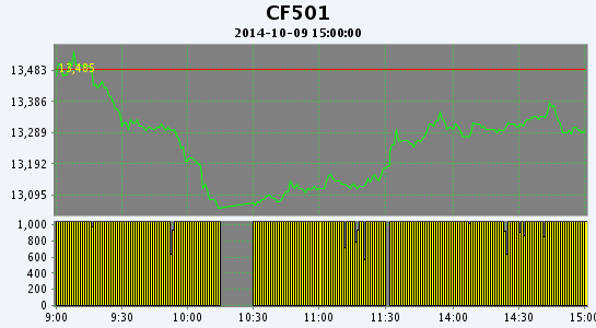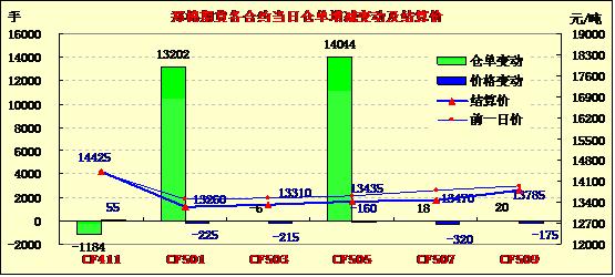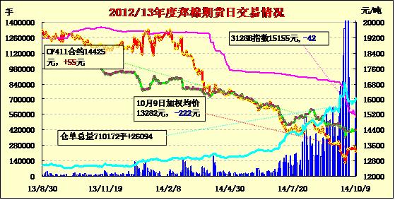 10月9日,鄭棉CF1501合約平開,早盤在空頭賣盤打壓下走低,隨后在空頭回補(bǔ)推動下回穩(wěn),日線形成長下影線的陰線,日內(nèi)成交量放大,持倉量增加?;久媲闆r:據(jù)調(diào)查,隨9月底農(nóng)發(fā)行、信用社等支持收購貸款全部到位,南疆庫爾勒、阿克蘇、喀什三地棉花加工企業(yè)大部分都已開秤收購,但籽棉收購價格的走向卻“大相徑庭”,庫爾勒尉犁、普惠北四縣等棉花主產(chǎn)區(qū)40%衣分、11%以內(nèi)水份籽棉價格穩(wěn)定在5.60-5.80元/公斤,個別棉區(qū)收購價甚至回落至5.50元/公斤左右;而阿克蘇西大橋、沙雅等地由于非農(nóng)發(fā)行貸款企業(yè)占據(jù)主體,搶收、抬級抬價的現(xiàn)象再次出現(xiàn),40%衣分籽棉從9月28日-10.5日的5.80-6.0元/公斤至6.10-6.20元/公斤,最高收購價也上調(diào)至6.50元/公斤(43%以上衣分);巴楚、麥蓋提等地籽棉收購價格比較穩(wěn)定,40%衣分5.70-5.80元/公斤,水份大、籽棉品級稍差的籽棉5.5元/公斤。