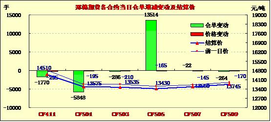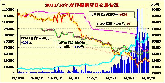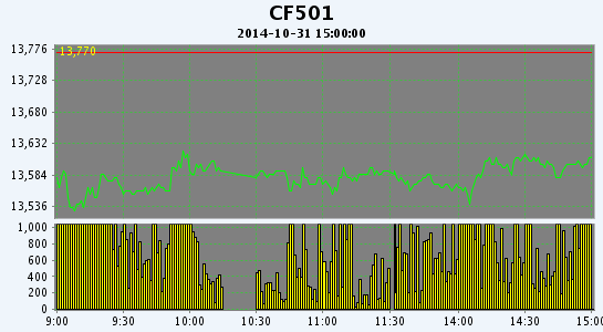 10月31日,鄭棉CF1501、1505合約低開,早盤下試后反彈,此后橫向震蕩,日線形成低開2/3下影線的小陰線,日內成交量萎縮,持倉量近增遠減。