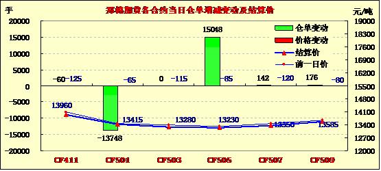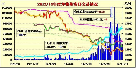 11月11日,鄭棉CF1501、1505合約低開,早盤反彈,隨后區(qū)間震蕩,午后一度下滑,尾盤在空頭回補(bǔ)盤支撐下反彈,日線形成低開小陽線,日內(nèi)遠(yuǎn)月成交量放大,持倉量增加?;久媲闆r:目前南疆多數(shù)地區(qū)籽棉采摘進(jìn)度接近尾聲,后期花上市量增多,籽棉價(jià)格小幅下滑,主流報(bào)價(jià)在6.0-6.2元/公斤,霜花則普遍低于6.0元/公斤,部分不足5.5元/公斤。阿克蘇市區(qū)、阿瓦提、巴楚等地仍然存在6.4元/公斤的高價(jià),籽棉采摘進(jìn)度相對(duì)緩慢。近期下游紡企采購積極性難增,站臺(tái)成交整體來說不溫不火,目前白棉二、三級(jí)站臺(tái)主流提貨價(jià)在14500-14700元/噸,白棉二級(jí)花價(jià)格稍高100-200元/噸。近期南疆皮棉市場整體走量遲緩,因此軋花廠壓力繼續(xù)加重,近期停收或仍將增多。