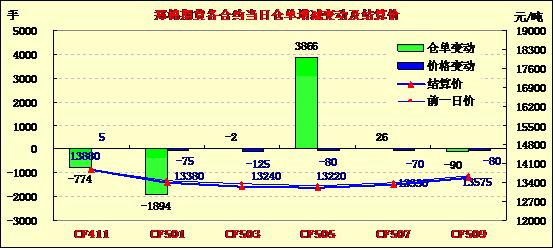 11月13日,鄭棉CF1501、1505合約低開,盤中區(qū)間震蕩,午后重心下移,CF1501日線形成小陰線,CF1505收陽線星,日內(nèi)成交量溫和放大,持倉量近減遠(yuǎn)增。基本面情況:北疆籽棉市場接近尾聲,手采籽棉同樣存在較大差價(jià),中期手采花在5.8-6.1元/公斤,霜花則普遍低于5.5元/公斤,機(jī)采棉主流收價(jià)基本平穩(wěn)在5.0元/公斤,霜花4.5-4.6元/公斤。霜花上市增多,軋花廠采購熱情偏低,籽棉價(jià)格繼續(xù)存在回落空間。目前北疆手采皮棉主流站臺提貨價(jià)在14400-14700元/噸,優(yōu)質(zhì)機(jī)采皮棉提貨價(jià)在13700-13900元/噸,機(jī)采棉低價(jià)在13500元/噸以下,近期站臺成交不旺,部分軋花廠謹(jǐn)慎觀望籽棉市場,同時(shí)積極銷售自身皮棉現(xiàn)貨。