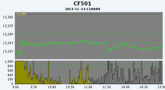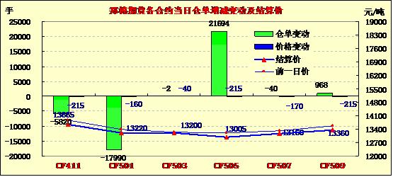 11月14日,鄭棉CF1501、1505合約低開,盤中區(qū)間震蕩,CF1501日線形成小陽線,CF1505形成陰線星,日內(nèi)遠(yuǎn)月成交量放大,持倉量近減遠(yuǎn)增?;久媲闆r:南疆籽棉收價基本平穩(wěn),優(yōu)質(zhì)籽棉逐漸減少,6.4元/公斤的高價仍然存在,中期花主流價格在6.0-6.4元/公斤,降雨降雪后霜花較多,部分軋花廠已停收??κ膊糠謪^(qū)縣、阿克蘇市區(qū)、阿瓦提等地受霜凍影響不大,仍然有少部分籽棉未采摘,但整體質(zhì)量已大不如前,籽棉價格將繼續(xù)下滑。南疆站臺白棉三級主流提貨價在14600元/噸左右,近期下游詢采難增,部分棉紡企業(yè)甚至壓價采購,使得一些新疆軋花廠惜售優(yōu)質(zhì)皮棉。