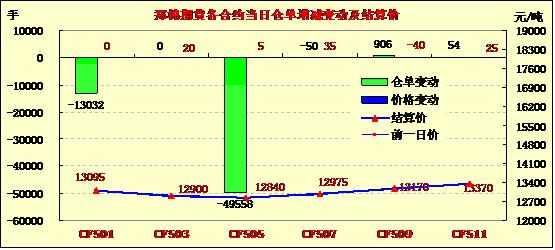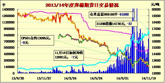 11月18日,鄭棉CF1501、1505合約高開,盤在空頭回補推動下反彈,尾盤收高,日線形成小陽線,日內(nèi)成交量萎縮,持倉量減少。基本面情況:南疆籽棉繼續(xù)收購,巴州、阿克蘇地區(qū)部分區(qū)縣籽棉交售臨近尾聲,霜花較多,軋花廠陸續(xù)停收,喀什地區(qū)、阿克蘇阿瓦提等地籽棉仍有部分未采摘,近期并未下霜,中期花仍然大量交售中。今日中期籽棉到廠均價在6.2元/公斤,零星高價6.4元/公斤,霜花則普遍仍然低于6元/公斤。目前南疆站臺白棉三級主流提貨價在14500-14600元/噸,部分14400元/噸可成交,下游需求持續(xù)乏力,壓花廠意向移庫內(nèi)地銷售,近期對高等級皮棉的惜售情緒仍然存在。阿瓦提部分棉農(nóng)反饋,尾期花交售困難,棉企多拒收。