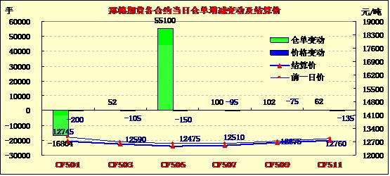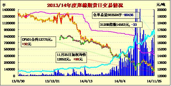 11月25日,鄭棉CF1501、1505合約低開(kāi),盤(pán)中在空頭回補(bǔ)推動(dòng)下放量走高,日線形成長(zhǎng)陽(yáng)線,日內(nèi)成交量放大,持倉(cāng)量大幅減少?;久媲闆r:因山東某大型紡織集團(tuán)將3128B皮棉進(jìn)價(jià)一次性下降400元/噸至13000元/噸及鄭州棉花期貨價(jià)格大跌影響,安慶棉區(qū)籽棉收購(gòu)價(jià)格和皮棉銷(xiāo)售價(jià)格應(yīng)聲大跌,許多棉企直接將籽棉收購(gòu)價(jià)格調(diào)到3.00元/斤,每斤籽棉價(jià)格較上周下跌了0.15元左右,不少棉企為規(guī)避風(fēng)險(xiǎn)只好暫時(shí)停止了籽棉收購(gòu)。面對(duì)突如其來(lái)的行情變化,有庫(kù)存皮棉的棉企主動(dòng)出擊,紛紛下調(diào)皮棉銷(xiāo)售價(jià)格,大廠的4128B皮棉報(bào)價(jià)在13600元/噸,小廠4128B皮棉報(bào)價(jià)在13200元/噸,每噸較上周下跌了400-500元。本來(lái)目前安慶棉區(qū)的棉市漸趨穩(wěn)定,籽棉收購(gòu)價(jià)格維持在3.00-3.20元/斤,皮棉銷(xiāo)售價(jià)格維持在13500-14200元/噸水平,市場(chǎng)購(gòu)銷(xiāo)比較活躍,但這次價(jià)格的快速下跌讓棉企感受到了市場(chǎng)的殘酷,幾乎所有棉企都會(huì)形成虧損。據(jù)了解,幾家存有籽棉或皮棉較多的棉企虧損額要達(dá)到幾十萬(wàn)元。此次行情的變化對(duì)大小棉企打擊很大,也將使棉市購(gòu)銷(xiāo)比較活躍局面轉(zhuǎn)向冷清。