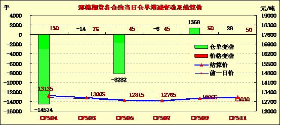 11月28日,鄭棉CF1501、1505合約低開,盤中區(qū)間震蕩,午后增量上行,尾盤在平倉盤壓下走低,日線形成小陽線,日內(nèi)成交量萎縮,持倉量減少。基本面情況:進(jìn)入11月下旬,南疆喀什(含巴楚)、阿克蘇棉區(qū)籽棉采摘進(jìn)度已達(dá)到90%左右,大部分縣市拾花開始收尾,麥蓋提、伽師、莎車、岳普湖等地籽棉采摘基本結(jié)束,棉田開始澆灌“凍水”,阿克蘇的沙雅、阿瓦提、新和等預(yù)計12月上旬拾花結(jié)束;南疆整體加工進(jìn)度也達(dá)到70%-75%,由于氣溫大幅下降導(dǎo)致皮棉回潮過大,再加上隨大量皮棉入監(jiān)管庫南疆鐵路運輸出疆困難逐漸增大,因此棉花企業(yè)大多采取快速收購、快速加工,快速入庫公檢,在疆內(nèi)銷售不暢甚至停滯的情況下,及時申請車皮運至山東、江蘇、河南、湖北等消費集散地。