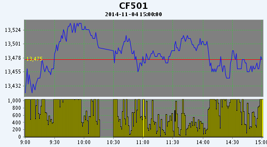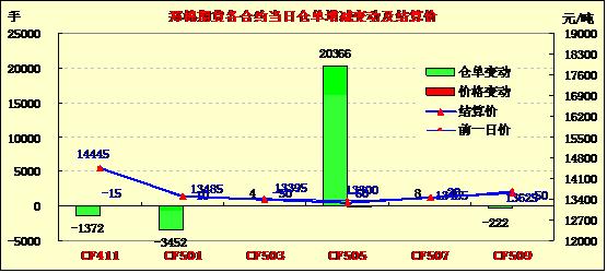 11月4日,鄭棉CF1501、1505合約高開,早盤沖高,隨后后在多頭平倉盤打壓下走低,日線形成星線,日內(nèi)成交量變化不大,持倉量近減遠(yuǎn)增。