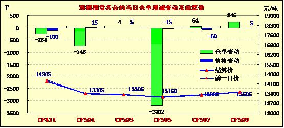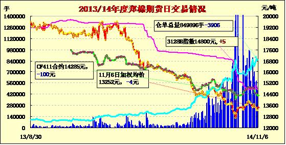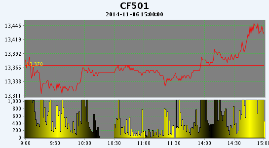 11月6日,鄭棉CF1501、1505合約高開,早盤探低后在空頭回補(bǔ)盤的支撐下反彈,午后走高,日線形成小陽線,日內(nèi)成交量萎縮,持倉量減少。