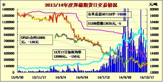 12月17日,鄭棉夜盤低開,1505合約在多頭平倉打壓下走低,今日早盤小幅反彈,日線形成小陰線,日內(nèi)成交量放大,持倉量減少?;久媲闆r:河北邢臺的棉花企業(yè)艱難經(jīng)營籽棉收購工作,近期地產(chǎn)棉現(xiàn)貨銷售略有好轉(zhuǎn),棉花企業(yè)加強(qiáng)籽棉收購工作以增加收益,預(yù)計(jì)在春節(jié)前夕當(dāng)?shù)刈衙奘召徆ぷ鲗⑾破鹨粋€(gè)小高潮。12月16日當(dāng)?shù)噩F(xiàn)貨3128級皮棉銷售價(jià)格為13000元/噸(毛重自提帶票價(jià)格),恢復(fù)至月初銷售水平,因此現(xiàn)貨銷售速度有所好轉(zhuǎn),但是企業(yè)利潤空間依舊較窄,棉企謹(jǐn)慎籽棉收購工作,有渠道銷售才進(jìn)行大量收購生產(chǎn)。