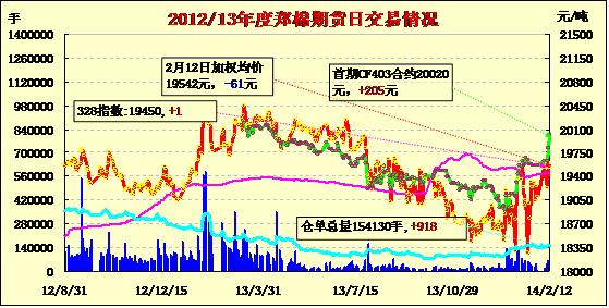 2月12日,鄭棉CF1405合約高開,早盤調(diào)整后震蕩回升,日線形成陽線星,日內(nèi)成交量萎縮,持倉量增加。CF1405合約日成交17908手,日增倉578手,終盤持倉量74916手;CF1409合約日成交1120手,日減倉164手,終盤持倉量21768手。基本面情況:目前保稅區(qū)港口庫存不多,大多為印度棉,美棉較少。近期外棉報價維持高位,企業(yè)大量訂貨意愿不高;下游開工企業(yè)仍相對不多,生產(chǎn)未完全恢復(fù)。