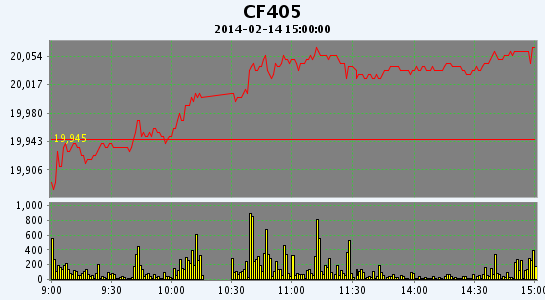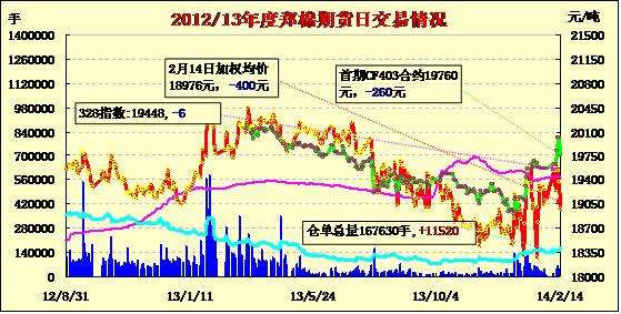 2月14日,鄭棉CF1405合約平開,盤中在多頭買盤推動下上行,午后橫向盤整,日線形成陽線,日內(nèi)成交放量,持倉量增加。CF1405合約日成交27502手,日增倉3076手,終盤持倉量78298手;CF1409合約日成交1334手,日減倉228手,終盤持倉量22088手?;久媲闆r:春節(jié)假期過后期貨一直堅挺,加之部分中小型企業(yè)還沒有開工,外棉現(xiàn)貨市場冷冷清清。據(jù)某國際棉商反映,元旦過后美棉成交較多,春節(jié)以來詢盤很少,目前尚未開張。