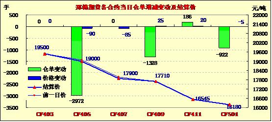 3月11日,鄭棉CF1405合約低開,早盤反彈,午后在集中平倉盤打壓下走低,日線形成陰線星,日內(nèi)成交量萎縮,持倉量減少。CF1405合約日成交22726手,日減倉2972手,終盤持倉量54594手;CF1409合約日成交12088手,日增倉1328手,終盤持倉量33996手。