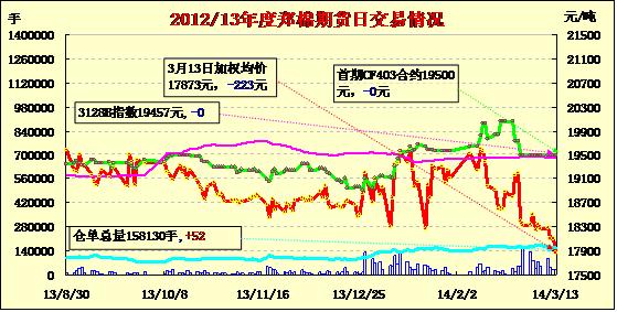 3月13日,鄭棉CF1405合約高開,早盤反彈后在橫向震蕩,日線形成陽線,日內(nèi)成交量萎縮,持倉量減少。CF1405合約日成交10690手,日減倉880手,終盤持倉量51548手;CF1409合約日成交17600手,日增倉508手,終盤持倉量35932手?;久媲闆r:全棉紗成交仍舊不暢,主要以小批量成交;外紗近期成交也不佳,主要受市場(chǎng)對(duì)政策預(yù)期的影響,買賣雙方心理價(jià)位相差較大;港口外棉成交處于持續(xù)清淡中,質(zhì)量較好的外棉目前不多,報(bào)價(jià)大多相對(duì)較高。