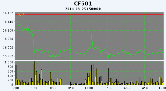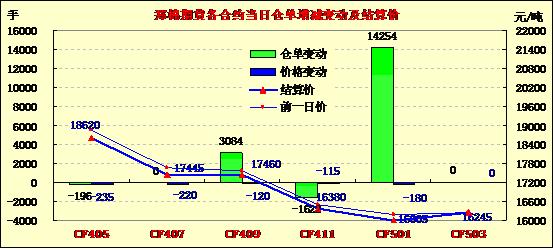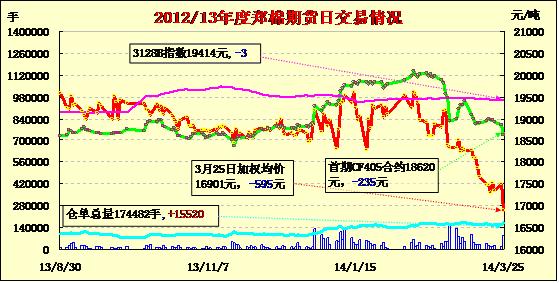 3月25日,鄭棉CF1405合約大幅低開(kāi),盤(pán)中在空頭逢低回補(bǔ)支撐下反彈,日線形成低開(kāi)陽(yáng)線,日內(nèi)成交量放大,持倉(cāng)量減少。CF1405合約日成交6562手,日減倉(cāng)196手,終盤(pán)持倉(cāng)量45818手;CF1409合約日成交41158手,日增倉(cāng)3084手,終盤(pán)持倉(cāng)量41972手。基本面情況:有關(guān)部門(mén)決定自4月1日起,標(biāo)準(zhǔn)級(jí)競(jìng)賣底價(jià)將由18000元/噸調(diào)整為17250元/噸;港口外棉人民幣報(bào)價(jià)相對(duì)持穩(wěn),美金報(bào)價(jià)近期有所上漲,整體來(lái)看,很少有成交。