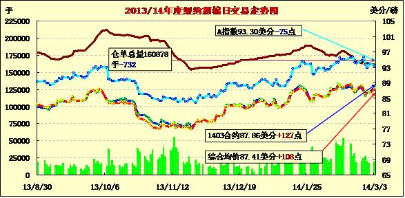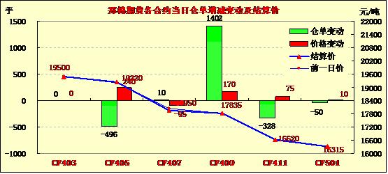 3月4日,鄭棉CF1405合約高開(kāi),盤(pán)中區(qū)間震蕩,午間一度走高后調(diào)整,午后在空頭回補(bǔ)支撐下回升,日線形成陽(yáng)線長(zhǎng)星,日內(nèi)成交量較前一日縮小,持倉(cāng)量減少。CF1405合約日成交51556手,日減倉(cāng)496手,終盤(pán)持倉(cāng)量71592手;CF1409合約日成交20520手,日增倉(cāng)1402手,終盤(pán)持倉(cāng)量24556手?;久媲闆r:近期受益于人民幣貶值,對(duì)紡織服裝、玩具鞋帽等行業(yè)復(fù)蘇有一定幫助;港口現(xiàn)貨價(jià)格報(bào)價(jià)持穩(wěn),整體出貨一般。保稅區(qū)以及船期外棉銷(xiāo)售較為清淡。