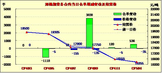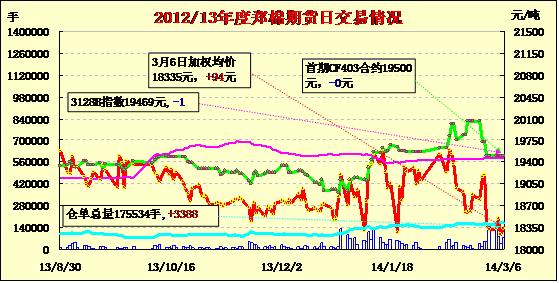 3月6日,鄭棉CF1405合約低開,早盤沖高回落,午后再度回升,日線形成長(zhǎng)陽線星,日內(nèi)成交量放大,持倉量減少。CF1405合約日成交37956手,日減倉1118手,終盤持倉量72010手;CF1409合約日成交30516手,日增倉3838手,終盤持倉量29940手?;久媲闆r:近期企業(yè)競(jìng)賣儲(chǔ)備棉熱情并不高,基本是基于即期需求,少量競(jìng)賣;港口現(xiàn)貨難以銷售,一些印度棉現(xiàn)貨商降價(jià)拋售,船期銷售也基本很少;港口外紗報(bào)價(jià)略有下跌,但是據(jù)了解,走貨也并不好。