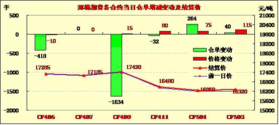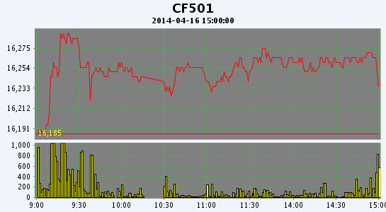 4月16日,鄭棉CF1501合約低開,早盤沖高后區(qū)間震蕩,日線形成陽線,日內(nèi)成交量溫和放大,持倉量增加。CF1409合約日成交3136手,日減倉1634手,終盤持倉量38022手;CF1501合約日成交38384手,日增倉264手,終盤持倉量122072手。基本面情況:近期進(jìn)口紗在經(jīng)歷了一段低迷平穩(wěn)后,隨著庫存的消耗,需求轉(zhuǎn)好,價(jià)格開始回升;港口外棉近期價(jià)格有所上漲,近日詢盤明顯減少,成交極少;全棉紗行情仍舊低迷,走貨一般。