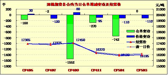 4月21日,鄭棉CF1501合約平開,盤中震蕩下滑,日線形成陰線,日內(nèi)成交量放大,持倉量減少。CF1409合約日成交6542手,日減倉1552手,終盤持倉量35524手;CF1501合約日成交43484手,日減倉742手,終盤持倉量117026手。基本面情況:,白銀棉業(yè)信息中心前往河南南陽地區(qū)進(jìn)行春播調(diào)研,了解到當(dāng)?shù)?a href='http://m.qdhqly.cn/News/Channel/?CID=31' title='更多棉花信息' target='_blank'>棉花種植面積逐年下降,今年較去年減少一半以上,部分棉農(nóng)開始育苗;由于當(dāng)?shù)刈衙拶Y源有限,且國家不再收儲,部分加工廠前往新疆包廠或轉(zhuǎn)行。