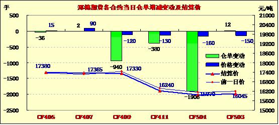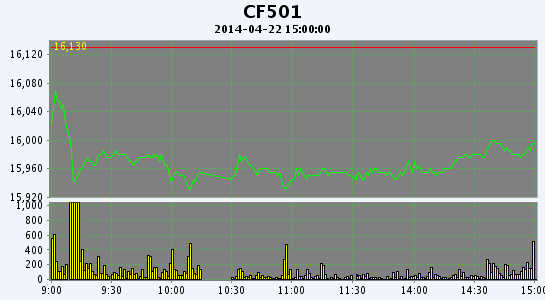 4月22日,鄭棉CF1501合約小幅低開,早盤反彈后在平倉盤壓制下回落,此后低位盤整,尾盤受到短線回補(bǔ)買盤支撐回升,日線形成陰線星,日內(nèi)成交量萎縮,持倉量減少。CF1409合約日成交7860手,日減倉940手,終盤持倉量34584手;CF1501合約日成交26210手,日減倉1906手,終盤持倉量115120手。