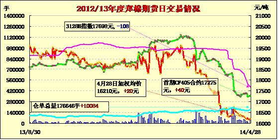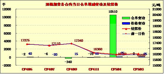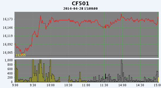 4月28日,鄭棉CF1501合約高開,早盤調(diào)整后在多頭買盤推動下走高,此后高位震蕩,日線形成高開陽線,日內(nèi)成交量放大,持倉量增加。CF1409合約日成交2028手,日減倉340手,終盤持倉量33006手;CF1501合約日成交43372手,日增倉10510手,終盤持倉量125050手。