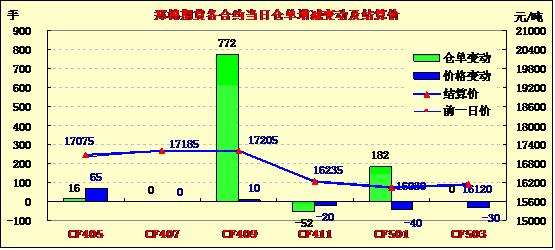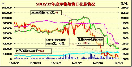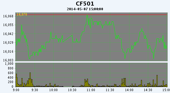 5月7日,鄭棉CF1501合約低開,盤中區(qū)間震蕩,尾盤收弱,日線形成2/3上影線的小陽線,日內(nèi)成交量萎縮,持倉量略有增加。CF1409合約日成交2152手,日增倉772手,終盤持倉量34472手;CF1501合約日成交14910手,日增倉182手,終盤持倉量128024手。