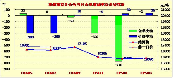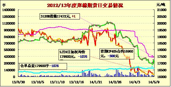 5月9日,鄭棉CF1501合約小幅高開,盤中窄幅震蕩,日線形成陽線星,日內(nèi)成交量萎縮,持倉量略有減少。CF1409合約日成交1344手,日減倉30手,終盤持倉量34130手;CF1501合約日成交9070手,日減倉776手,終盤持倉量128506手?;久媲闆r:目前受紡織市場(chǎng)季節(jié)性補(bǔ)庫提振,廣東、福建等南方市場(chǎng)服裝面料、箱包面料及飾品需求更新較快,加之4、5月份廣東、深圳等地開展的廣交會(huì)和紗線展,部分紗支局部走貨有所好轉(zhuǎn)。但是,紡織企業(yè)也在等待國內(nèi)政策細(xì)則出臺(tái),因此采購積極性依舊不高,隨用隨買,幾乎沒有庫存。目前,大多數(shù)紡企都維持開工狀態(tài),由于虧損加大,個(gè)別支撐不住的企業(yè)已經(jīng)停產(chǎn)。