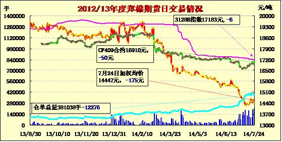7月24日,鄭棉CF1501合約平開,增倉下跌,隨后在空頭回補(bǔ)與多頭買盤支撐下止跌,午后回升,日線形成1/2下影線的陰線,日內(nèi)成交量放大,持倉量大幅減少。基本面情況:棉市行情不佳,成交稀少。當(dāng)前一些極早做好打算的企業(yè)赴疆包廠,但數(shù)量并不多,內(nèi)地絕大多數(shù)的企業(yè)比較謹(jǐn)慎,政策一刻不明朗便不會輕易有舉動。多數(shù)企業(yè)表示由于在當(dāng)?shù)囟嗄杲?jīng)營棉花,在業(yè)內(nèi)已經(jīng)具有“熟面孔”的固定老客戶,從銷售渠道上考慮目前只能觀望形勢。今年政策突然轉(zhuǎn)變,對于企業(yè)而言轉(zhuǎn)變是個比較困難抉擇。由于今年國家主要的目標(biāo)是積極扶植新疆的棉紡織產(chǎn)業(yè),而對于內(nèi)地而言則似乎有點受冷落,不少企業(yè)對于政策細(xì)則并不明朗而陷入迷茫。