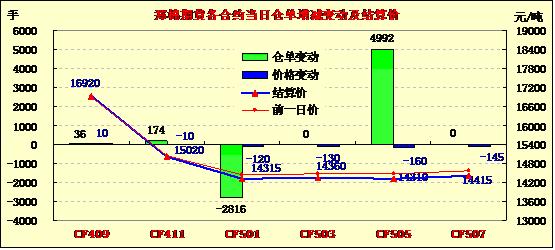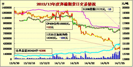 7月25日,鄭棉CF1501合約低開(kāi),早盤(pán)下滑后在多頭買(mǎi)盤(pán)支撐下止跌,午后受空頭回補(bǔ)推動(dòng)走高,日線(xiàn)形成低開(kāi)陽(yáng)線(xiàn),日內(nèi)成交量萎縮,持倉(cāng)量減少。基本面情況:國(guó)內(nèi)棉花現(xiàn)貨市場(chǎng)成交稀少,價(jià)格小幅下跌。當(dāng)前紡企成品庫(kù)存壓力比較大,后市預(yù)期價(jià)格將繼續(xù)下降,當(dāng)前拍儲(chǔ)棉花購(gòu)買(mǎi)也不積極,進(jìn)口棉價(jià)格下降趨勢(shì)增大。