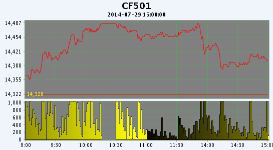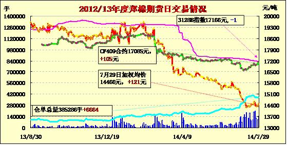 7月29日,鄭棉CF1501合約高開,早盤在多頭買盤支撐下上行,盤中高位增倉(cāng),午后受平倉(cāng)盤壓制下滑,日線形成高開陽(yáng)線星,日內(nèi)成交量放大,持倉(cāng)量增加?;久媲闆r:7月份山東各地多以高溫晴朗天氣為主,兩三次不大的降雨對(duì)久處干旱的棉苗帶來生機(jī)。但因雨量較小,棉田仍較干旱。目前各地棉花長(zhǎng)勢(shì)良好,病蟲害較輕,山東濟(jì)寧、菏澤一帶棉花種植面積較去年下降20-35%,如沒有大蒜套種支撐,當(dāng)?shù)孛藁ǚN植面積降幅將高于此比率。目前棉花株高在110-125厘米,略低于去年同期,伏前桃在4-6個(gè)/株,果枝12-15個(gè)/株,現(xiàn)蕾13-16%個(gè)/株,打頂和掐邊尖工作已結(jié)束一周左右,棉花正在往橫向發(fā)展,枝繁葉茂,但成熟速度略低于去年同期,主要因前期天氣氣溫低和中期天氣干旱造成。