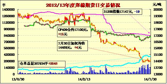 7月30日,鄭棉CF1501合約低開(kāi),早盤(pán)在多頭買(mǎi)盤(pán)支撐下上行,午后略有上漲,尾盤(pán)平倉(cāng)盤(pán)壓制下滑,日線形成低開(kāi)陽(yáng)線,日內(nèi)成交量萎縮,持倉(cāng)量增加?;久媲闆r:國(guó)內(nèi)棉花現(xiàn)貨價(jià)格繼續(xù)小幅下滑,棉市行情繼續(xù)寡淡,內(nèi)地紡織企業(yè)謹(jǐn)慎拍儲(chǔ),新疆棉相對(duì)更受青睞,地產(chǎn)棉出貨小量。有趁疆包廠的內(nèi)地企業(yè)已收購(gòu)前期準(zhǔn)備工作,如換地磅、修場(chǎng)地、準(zhǔn)備貨場(chǎng)等,但據(jù)悉堅(jiān)守在當(dāng)?shù)乩^續(xù)經(jīng)營(yíng)的企業(yè)占比更大。目前新疆及內(nèi)地大部棉區(qū)氣溫仍然較高,相對(duì)干燥,需及時(shí)灌溉,控制病蟲(chóng)害。