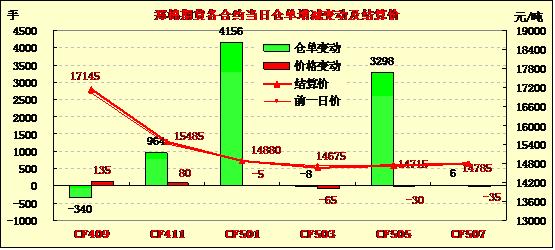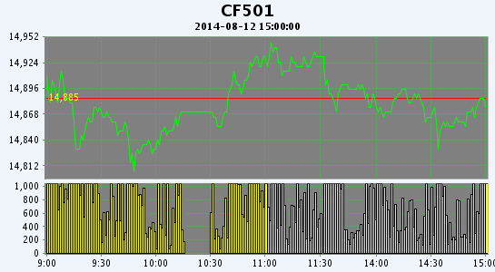 8月12日,鄭棉CF1501合約小幅低開,早盤調(diào)整后在多頭買盤推動(dòng)下走高,午后受到平倉盤打壓下滑,日線形成陰線星,日內(nèi)成交量萎縮,持倉量增加。基本面情況:國內(nèi)棉花現(xiàn)貨價(jià)格小幅上升,新棉上市推遲,國儲(chǔ)將于8月底停拍,供應(yīng)"斷檔期"將至,紡企補(bǔ)庫動(dòng)能升溫,短期棉價(jià)反彈或延續(xù),但需求未好轉(zhuǎn),疊加供應(yīng)壓力,中期棉價(jià)弱勢(shì)難改,反彈缺乏持續(xù)動(dòng)力。很多加工商認(rèn)為,如果鄭棉1月跌破14000元/噸,他們?cè)敢庠谄谪浬腺I入棉花等待交割并拋向現(xiàn)貨市場(chǎng)。